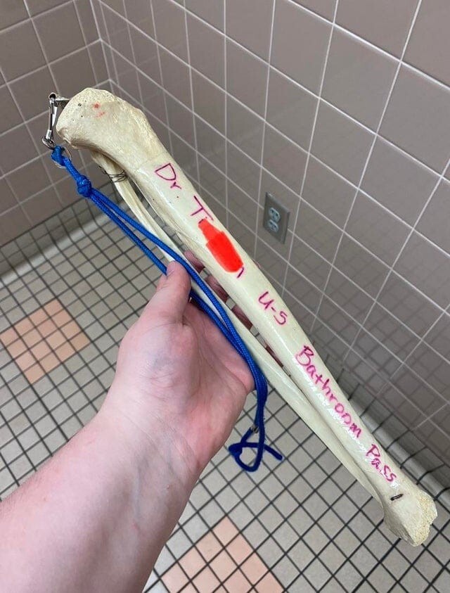 В качестве пропуска для похода в туалет наш учитель по анатомии даёт нам муляж человеческой кости