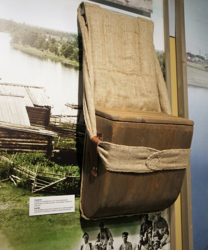 В своей работе эти ребята использовали специальный инструмент, облегчающий их нелёгкую работу. Это "седёлка" (она же "табуретка"), представляющая холщово-деревяную "разгрузку", которая надевалась на спину крючника и имела крепкий упор, на который ставился мешок. Его видно в районе поясниц мужиков на фото выше, но покажу вам её и отдельно: