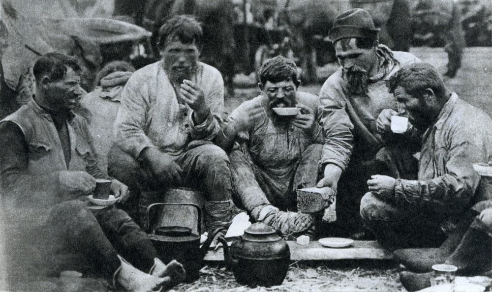 «Крючники сходили к воде, становились на колени или ложились ничком на сходнях или на плотах и, зачерпывая горстями воду, мыли мокрые разгоревшиеся лица и руки. Тут же на берегу, в стороне, где еще осталось немного травы, расположились они к обеду: положили в круг десяток самых спелых арбузов, черного хлеба и двадцать тараней. Гаврюшка Пуля уже бежал с полуведерной бутылкой в кабак и пел на ходу солдатский сигнал к обеду...».