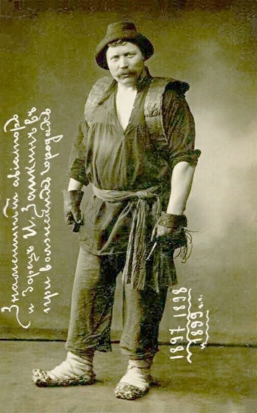 На фотографии выше знаменитый в своё время цирковой борец Иван Заикин в костюме крючника в 1897-99 гг. Родом он был с Поволжья и в 15 лет отец отдал его поработать крючником на пристани. Позже он вышел в "атлеты" и выступал в труппе Ивана Поддубного.