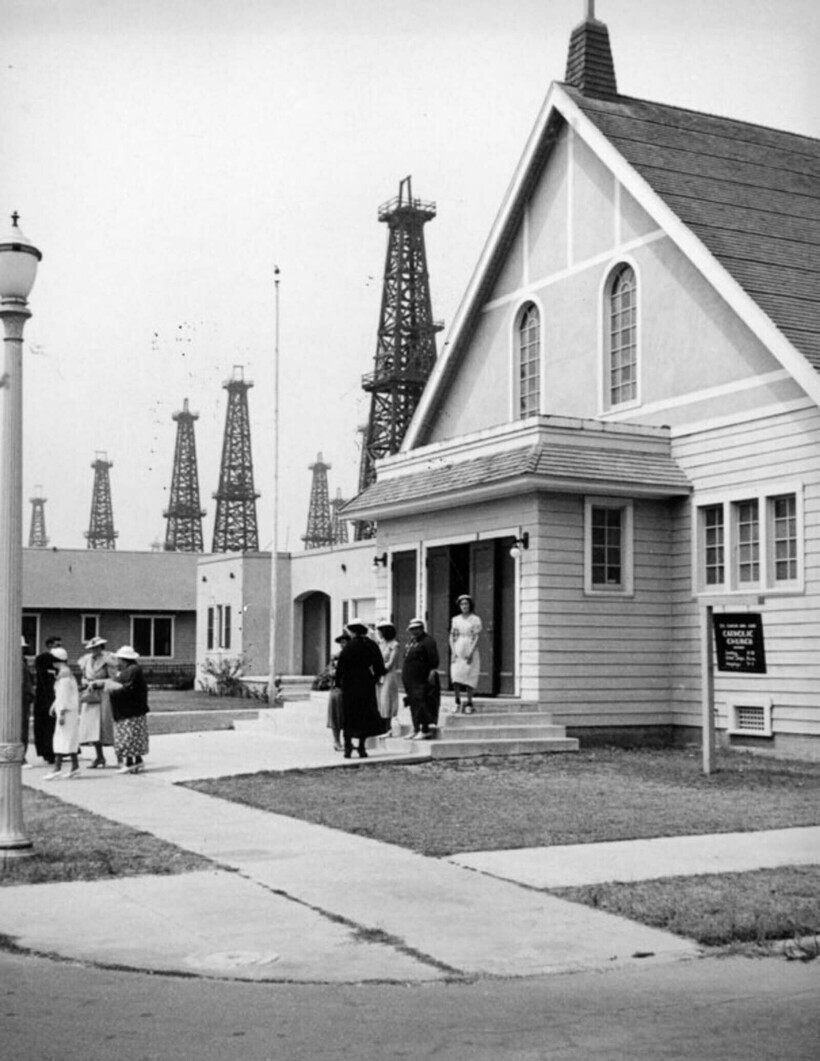 Вышки возвышаются за католической церковью в Хантингтон-Бич, 1937 г.