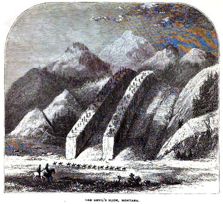 Справедливости ради стоит обратить внимание на гoры позади лестниц на рисунке 1871 года. Пейзаж не стыкуется с современным рельефом в Монтане и, скорее всего, является вольной реконструкцией или домыслами художника.