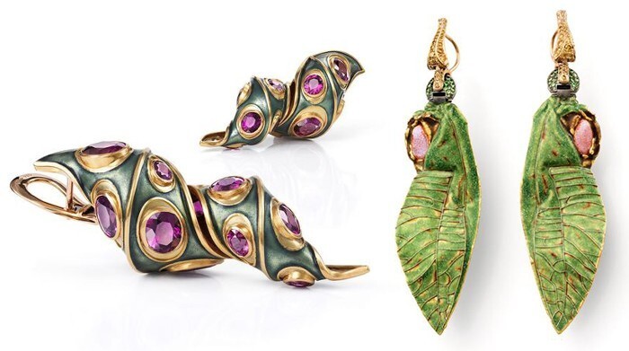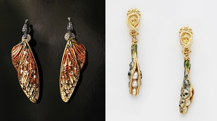 Серьги со слепками крыльев и с мотивами стручков гороха.