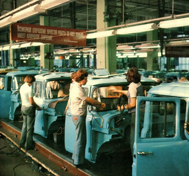 Конвейер сборки кабин в старом кузовном корпусе Завода им. Лихачёва, Москва, СССР. 1979 год
