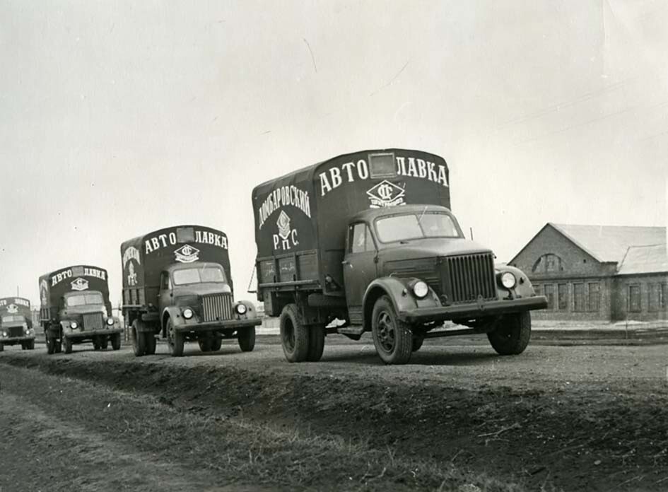 Колонна автолавок, состоящая из грузовиков ГАЗ – 51А с фургонами, отправляется для обслуживания сельского населения, 1960-е годы
