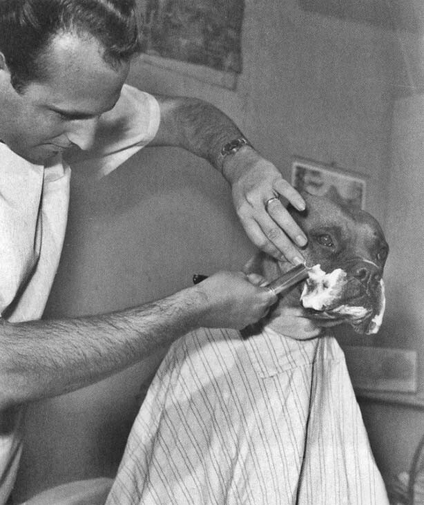 Парикмахер бреет известного на телевидении бульдога Фрица. Калифорния, апрель 1961 года