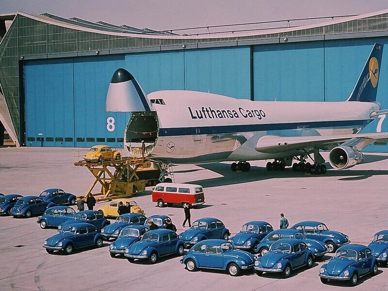 На борт Boeing 747 авиакомпании Lufthansa поместилось 72 автомобиля Volkswagen Beetle! 1972 год