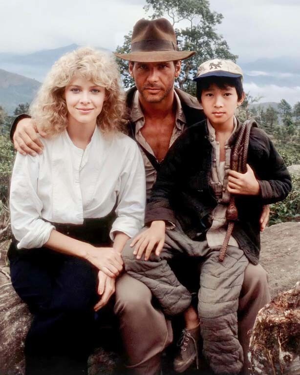 Кейт Кэпшоу, Харрисон Форд и Ке Хай Куан во время съемок фильма «Индиана Джонс и Храм Судьбы», 1984 год