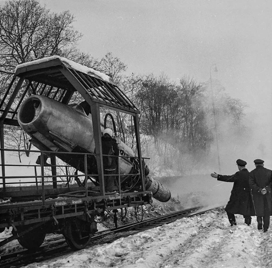 Чехословацкие железнодорожники расчищают пути с помощью двигателя МиГ-15 после сильной снежной бури в 1970 году