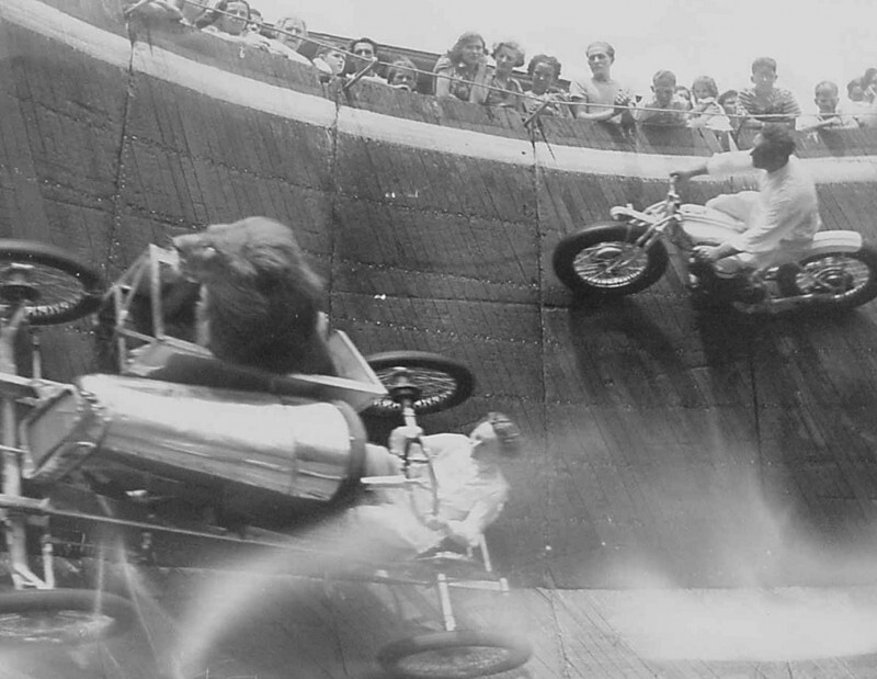 Лев едет в коляске на Стене Смерти (называемой Лиондром) в трюке, выполненном Джеком О'Мэлли и «Бесстрашным» Эгбертом. 1930-е годы