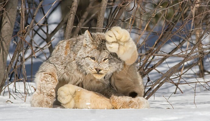 1. Канадская рысь "зависла" с огромной лапой наверх во время умывания, как делают и домашние кошки