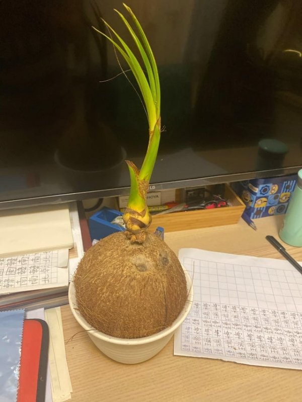 Я забыл свой кокос в кухонном шкафу, и он пророс. Выглядит как зеленый лучок!