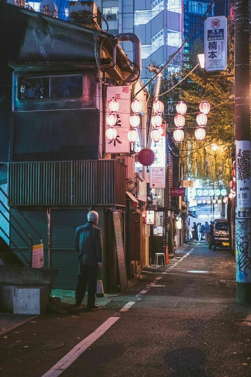 Мужчина направляется на так называемую улочку якитори, где находится множество маленьких баров