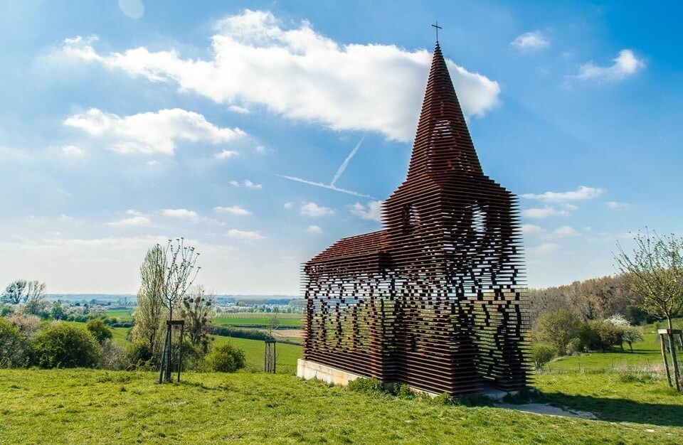 Необычный храм возведён из 100 слоёв кортеновской стали. Сложенные друг на друга листы, образуют иллюзию, которая в зависимости от угла зрения кажется полноценным зданием или невесомой конструкцией, которая практически полностью растворяется в окружающей среде.