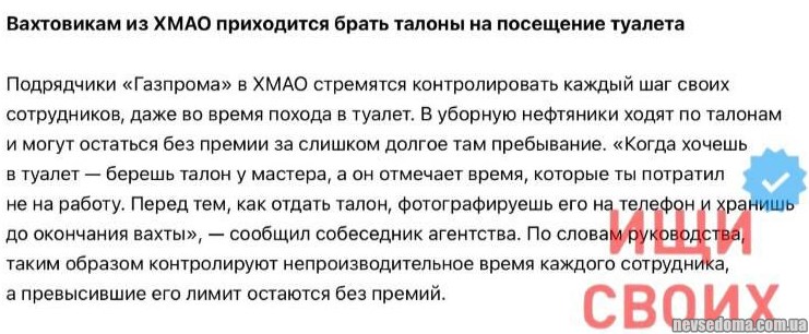 ▪️Подрядчики Газпрома в ХМАО выдают работникам талоны, чтобы сходить в туалет. Так они измеряют "производительное время"