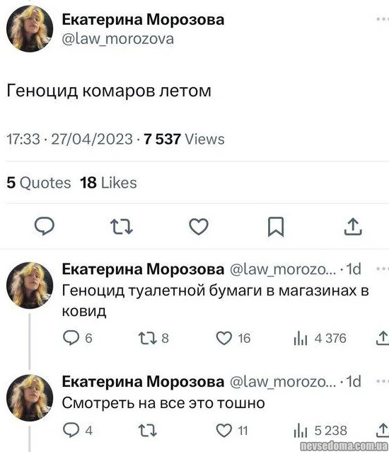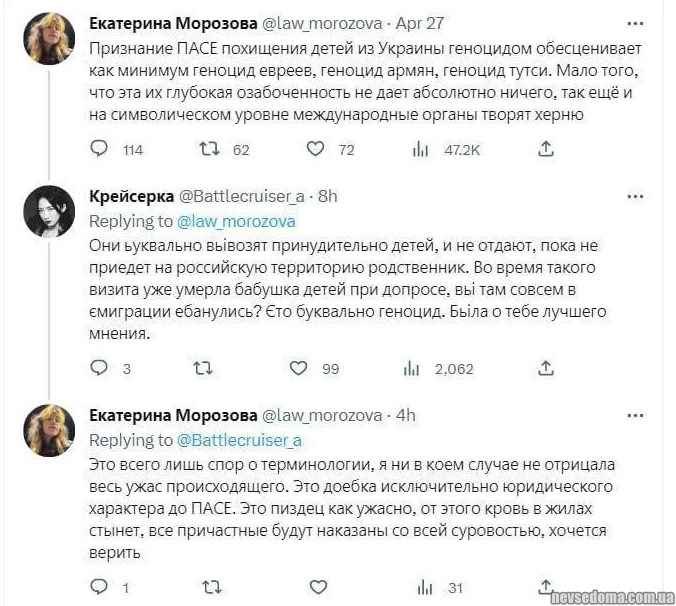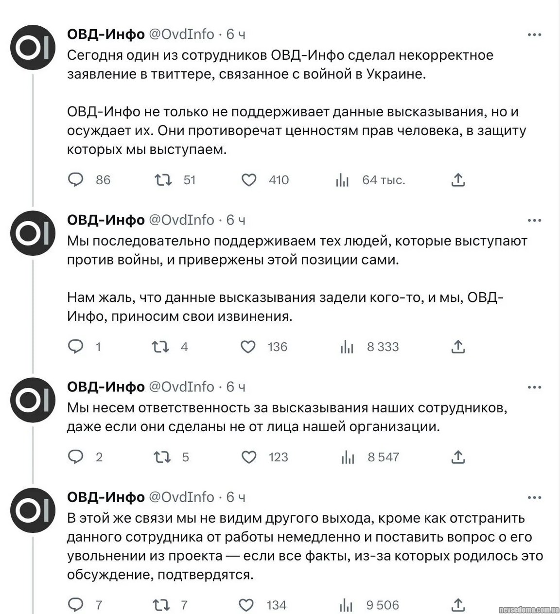 - Юристку ОВД-Инфо Екатерину Морозову, которая защищала задержанных оппозиционеров в рф и которая после одиночной акции у Минобороны 8 апреля 2022 года уехала в Польшу, уволили из ОВД-Инфо за тред в Твиттере