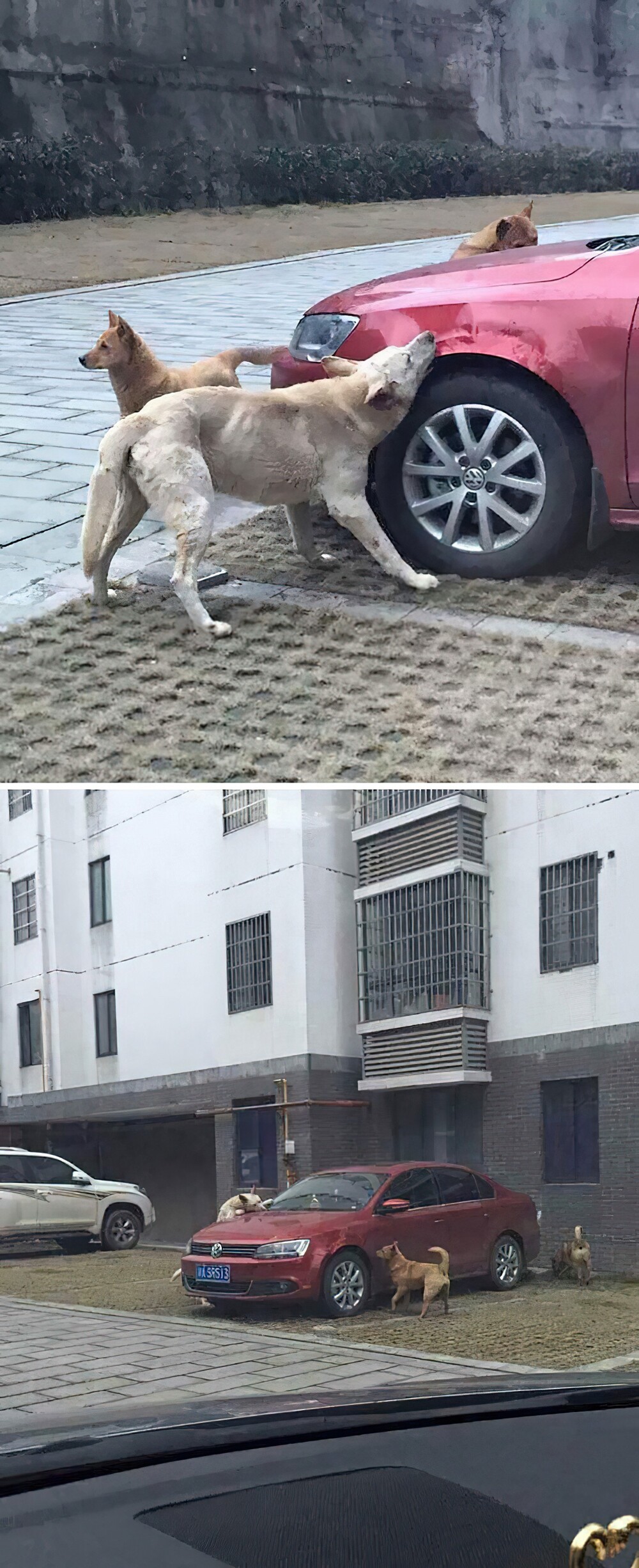 3. Мужик пнул бродячую собаку. Она вернулась со стаей своих друзей, чтобы попортить ему машину