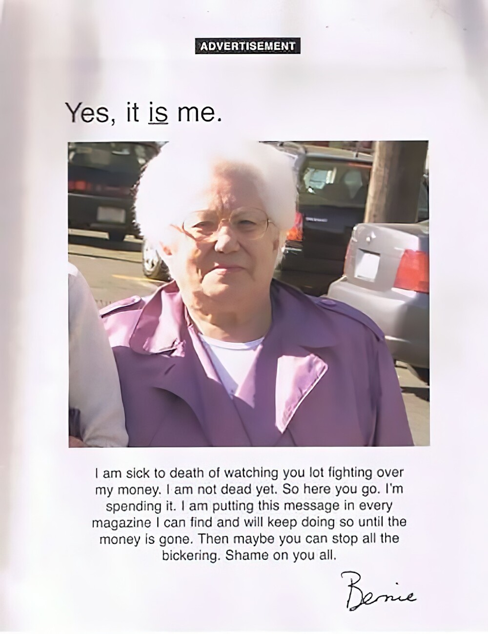 «Да, это я. Я до смерти устала наблюдать за тем, как вы дерётесь из-за моих денег. Я ещё не умерла. Поэтому будет так: я их потрачу. Я буду размещать это объявление во всех журналах, какие только найду, до тех пор, пока все деньги не кончатся. Может быть тогда вы прекратите ссориться. Позор вам всем».