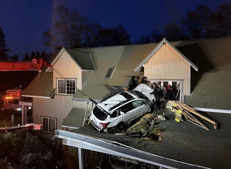 Сложно понять как, но этот автомобиль врезался во второй этаж частного дома