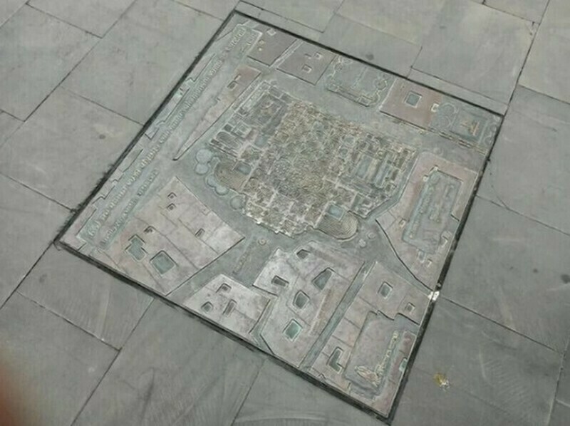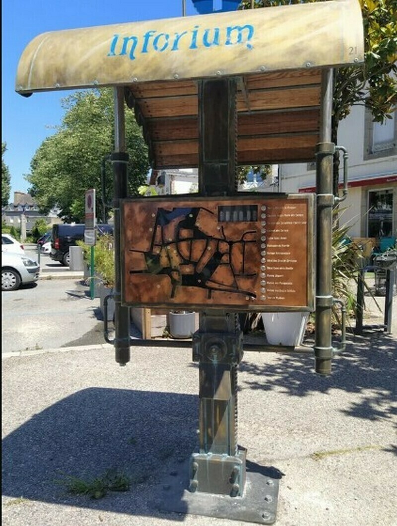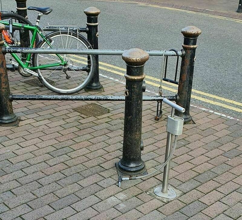 Вмонтированный в тротуар велосипедный насос рядом с парковкой велосипедов