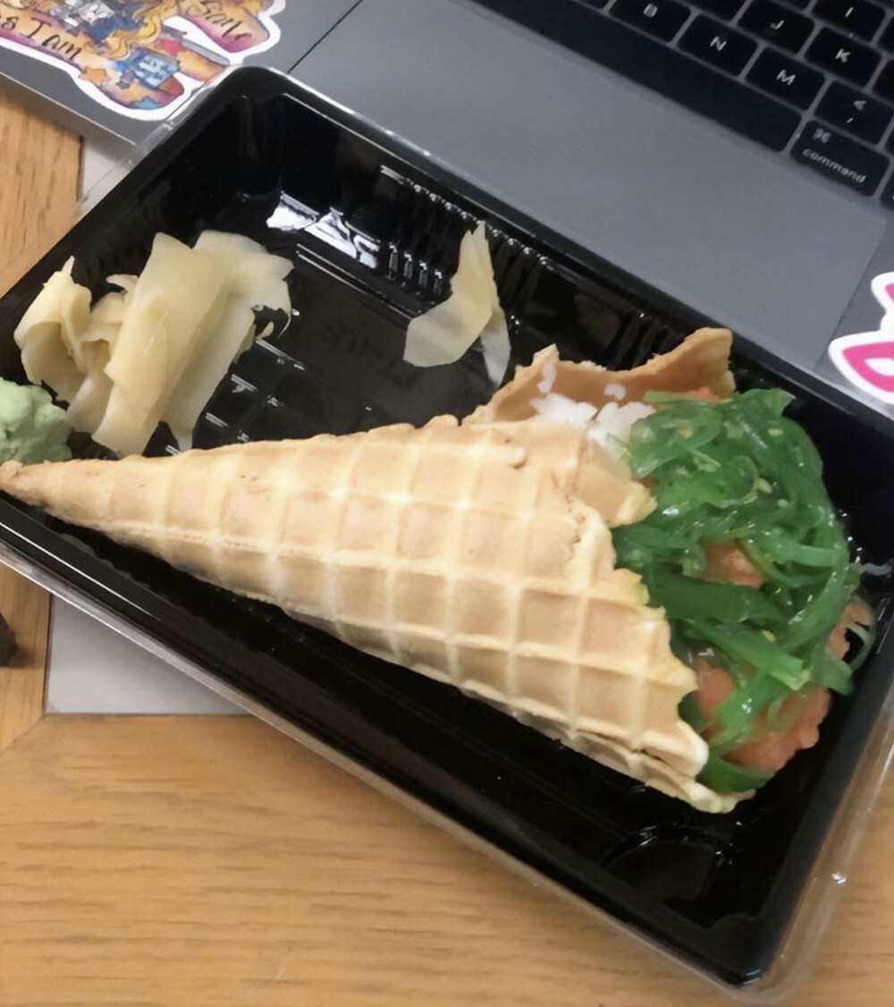 12. «Гурмэ темаки-суши в моей школе. Поправьте меня, если я ошибаюсь, но разве конус не должен быть из нори..?»