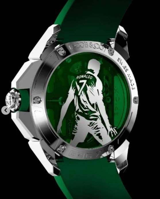Легендарный футболист стал обладателем коллекционных часов от Jacob & Co, которые оцениваются в 117 тысяч долларов. Естественно, на них изображен сам футболист, покрытый 26 бриллиантами на оправе. Часы из нержавеющей стали выделяются своим характерным зеленым цветом и черным ремешком.