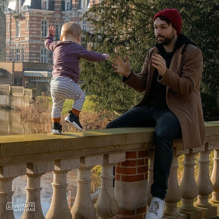 30. "Дочь делает первые шаги! Она счастлива тому, что может использовать обе ноги для ходьбы. Решил научить её ходить на этом прекрасном мосту. Главное - не смотреть вниз"
