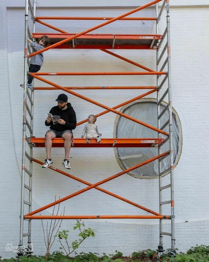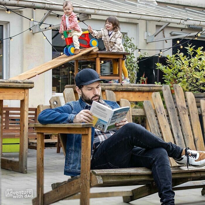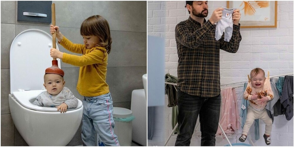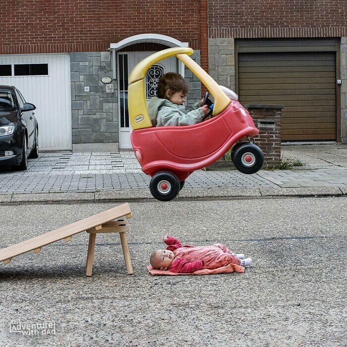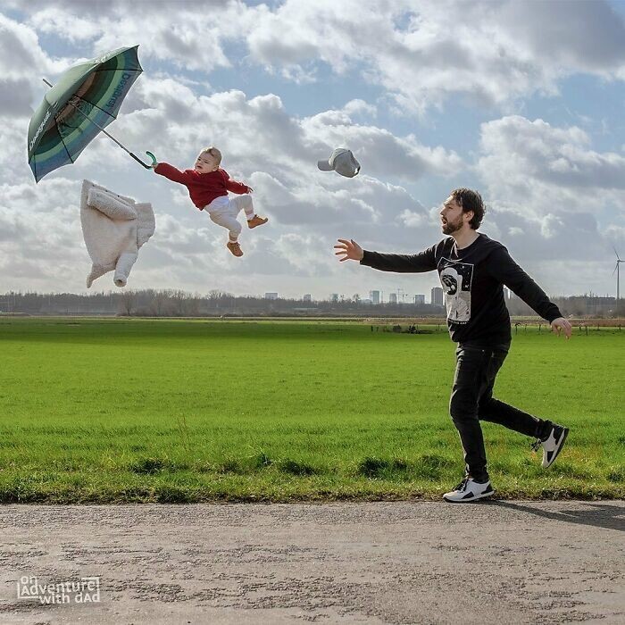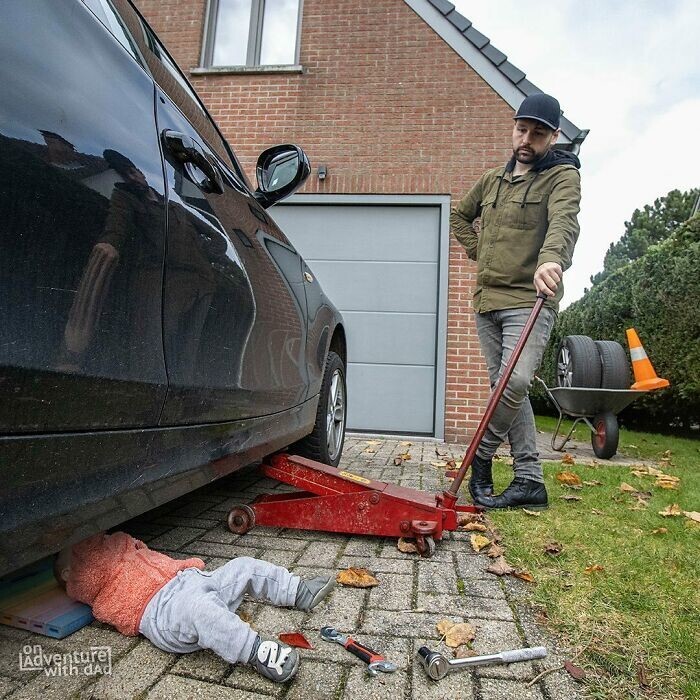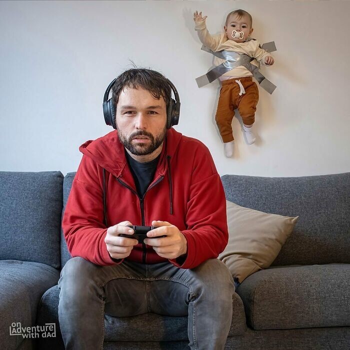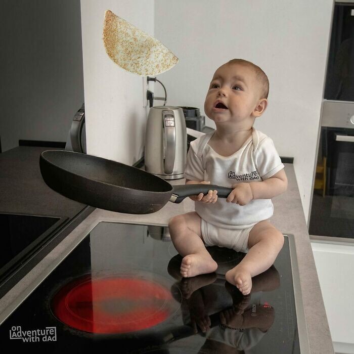 Когда дети остаются проводить время с папой, мама обязательно несколько раз напишет и спросит, всё ли в порядке. А в ответ папы иногда присылают фото детей. Креативный отец по имени Кенни Деусс (Kenny Deuss) придумывает идеи фото, которые можно отправить мамам в таком случае. Он фотошопит забавные кадры с "опасными" ситуациями, увидев которые, мамы упадут в обморок.