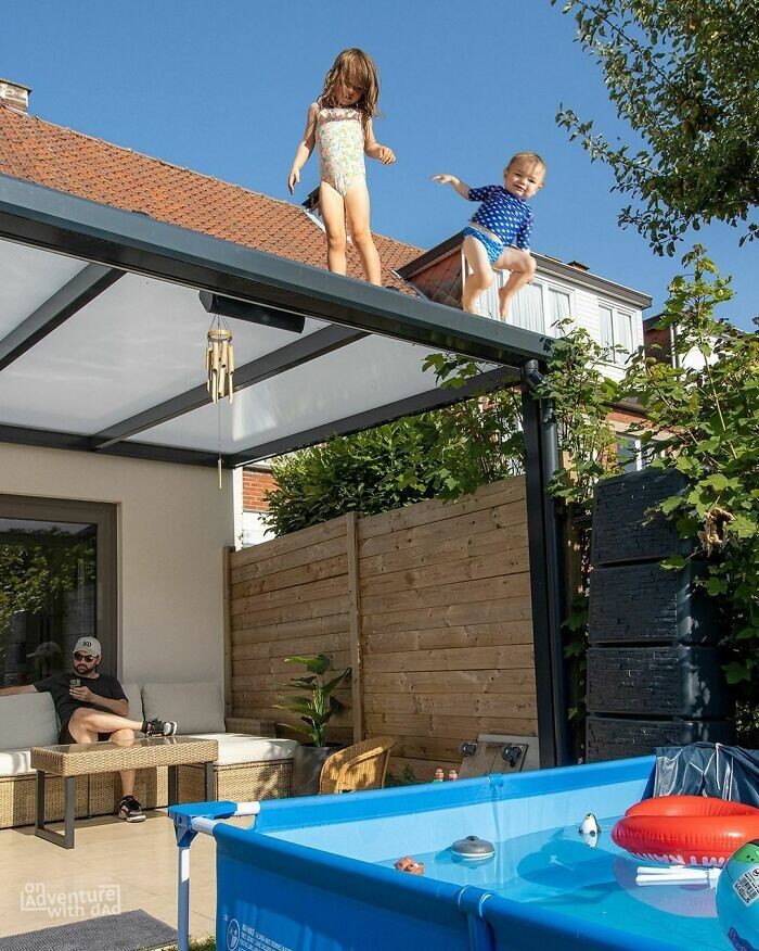 8. "Сегодня жара, и мы решили установить бассейн. Девочки решили немного попрыгать"
