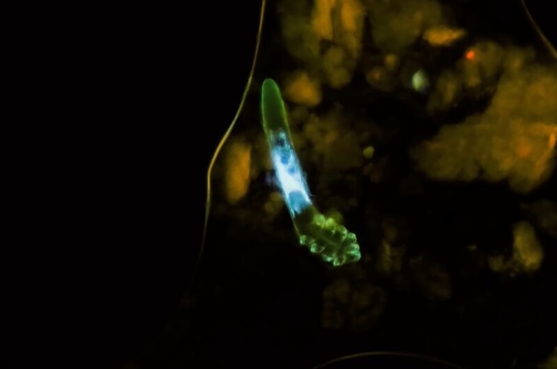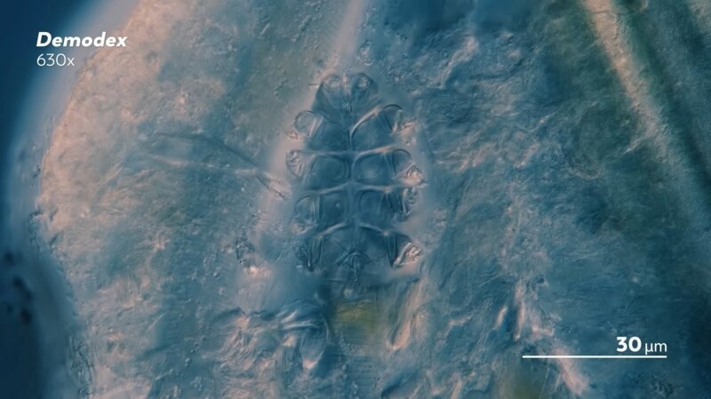Джеймс Вайс, специалист по микроскопии из Борнмутского университета, Англия, недавно показал интересное видео с участием клещей Demodex folliculorum, которых он увидел с помощью микроскопа на своём собственном лице. На видео можно заметить круглые капельки на лапках демодекса - это переваренные остатки кожного сала с человеческой кожи.