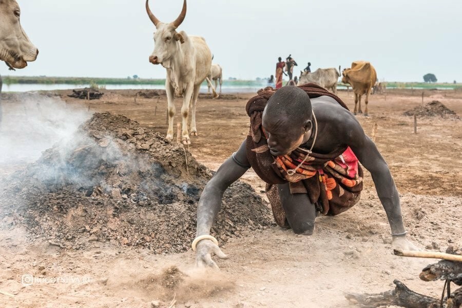 Да и пустыня — этот не райский пляж с рекламы Баунти: днем там стоит адская жара, а вот вечером и ночью — дикий холод. Племя вынуждено как-то согреваться. И оно нашло способ это делать. Для этого Мундари жгут коровий навоз: это не только дарит им тепло, но и защищает от насекомых — запах стоит такой, что москиты и прочие ползучие гады к ним не приближаются. Но и образовавшуюся после сожжения золу не выкидывают, а пускают в дело: ее наносят на кожу для защиты от солнца и насекомых, ей чистят зубы и отмывают посуду. В общем, из жизни с коровами Мундари пытаются выжать буквально все.