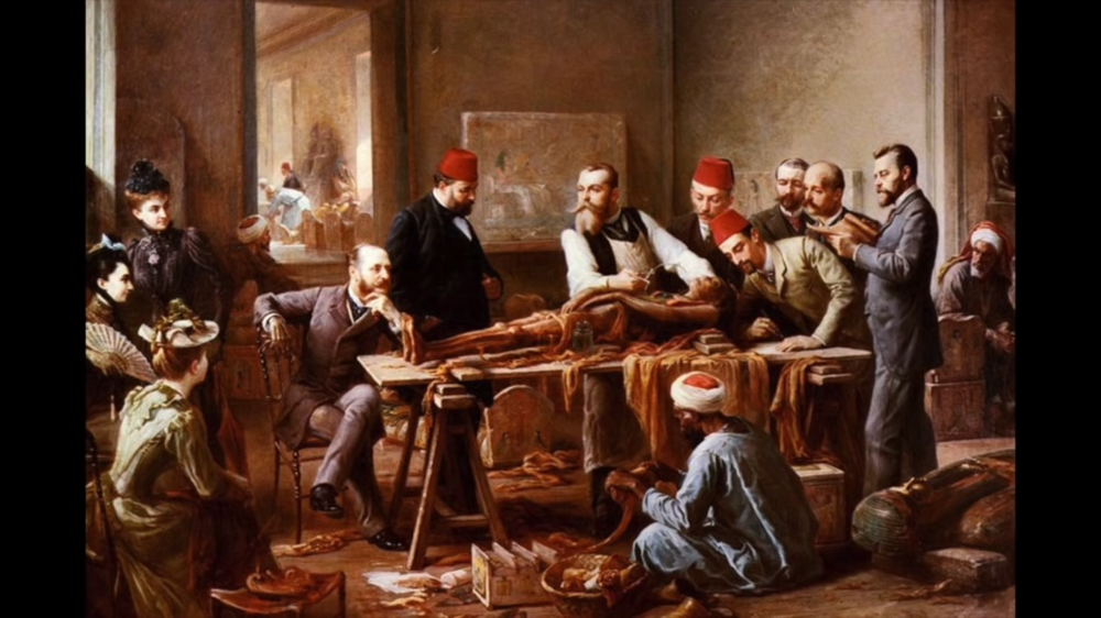 В 18-м и 19-м веках европейцы были страшно очарованы Древним Египтом, загробной жизнью и всем, что связано с мумиями. Очарование было настолько сильным, что получило название египтомании. Увлечение мумиями восходит к 15 веку, когда торговцы начали отправлять мумии из Египта в Европу. Считалось, что из них можно делать очень действенные лекарства от всех болезней на свете. Спрос на мумии достиг рекордно высокого уровня в 19 веке, отчасти из-за успеха египетской и сирийской кампаний Наполеона. Это вызвало огромный подъём интереса ко всякого рода древностями. Конечно, это не был чисто научный интерес; это было больше похоже на «Давайте устроим вечеринку по разворачиванию мумии!» Эти вечеринки в викторианском стиле выглядели примерно так: рассылались приглашения, люди собирались вместе в назначенный день, выпивали и закусывали, а потом разворачивали мумию и слушали лекцию какого-нибудь историка-египтолога. Придумал такие встречи и ввёл в моду выдающийся английский хирург Томас Петтигрю. Это было жутковато, но очень интересно.