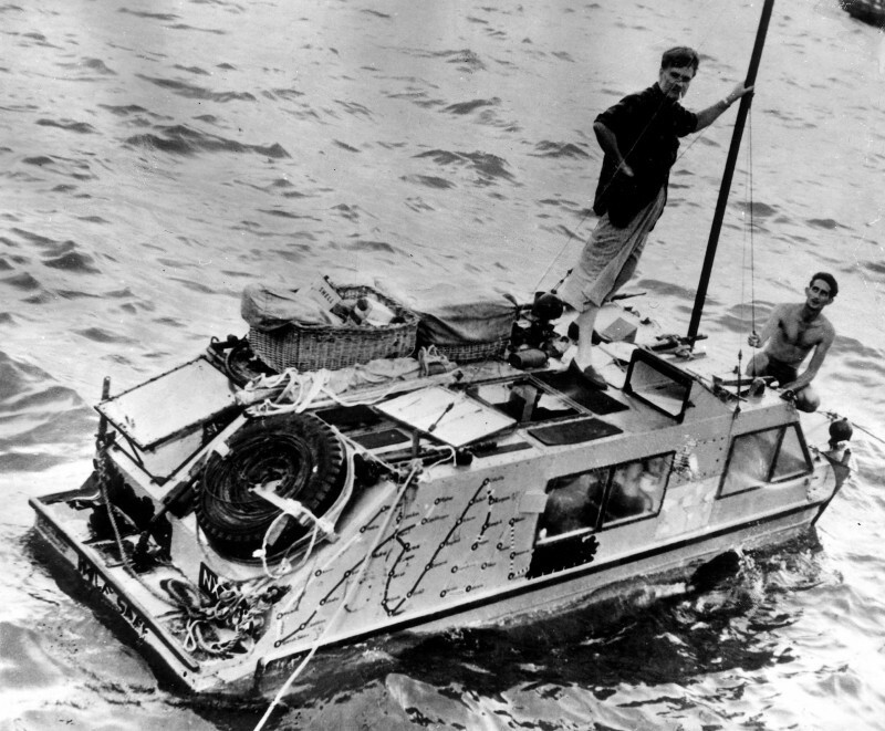 Бен Карлин и Барри Хэнли на своем джипе-амфибии в порту Гонконга. 1956 год