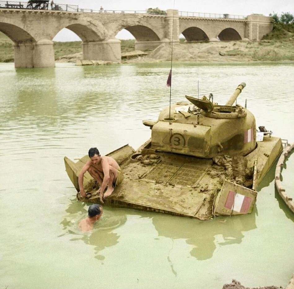 Британские танкисты купаются в реке Биферно на юге Италии, октябрь 1943 года