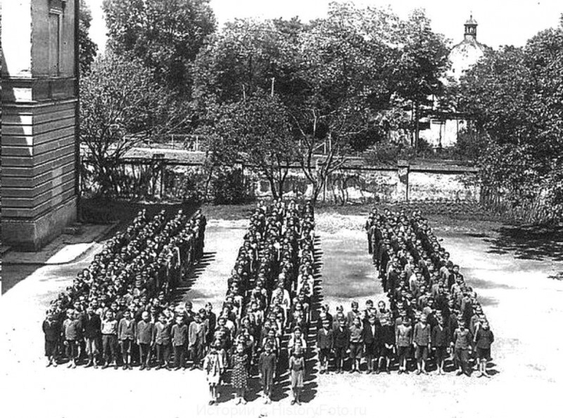 Учащиеся украинской гимназии в Перемышле на построении во дворе школы, 1942 год, оккупированная Украина