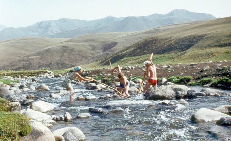 Ловля рыбы на реке Балыкты. Молодые рабочие геологической партии ловят рыбу в горной речке, 1975 год