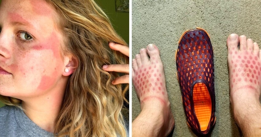 Стоит только солнышку начать как следует прогревать воздух, как на улицах появляются они — любители рискнуть и не намазаться солнцезащитным средством. Но даже те, кто всё-таки размазывают по себе SPF, не всегда оказываются в безопасности. Ведь солнечные лучи одинаково карают и тех, кто остался без защиты, и тех, кто это защиту намазал недостаточно тщательно. В итоге они ходят с неприятными ожогами разной степени болезненности и необычности!
