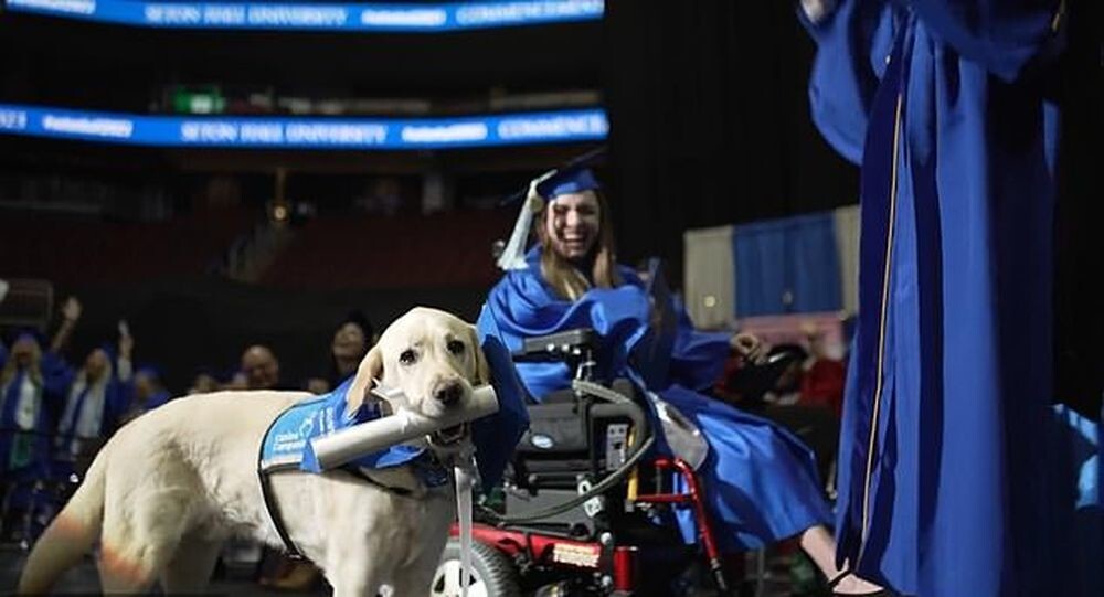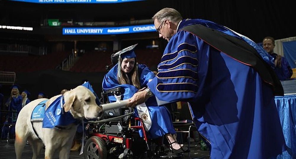 Грейс не может самостоятельно ходить и пользуется инвалидной коляской, поэтому на протяжении всего периода обучения верный собакен был рядом с ней на всех лекциях и практических занятиях. Недавно Грейс получила степень бакалавра, и, конечно же, на церемонию вручения диплома она отправилась вместе со своим верным хвостатым помощником.