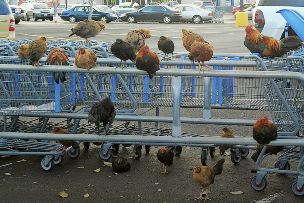 В 1950-х годах полинезийцам пришла в голову гениальная мысль. Они решили превратить остров Кауаи в огромную ферму. На острове и так жили дикие куры, которые отлично там себя чувствовали. Бизнесмены привезли на остров сотни тысяч бройлерных кур и стали их разводить. Бизнес шёл в гору, пока в 1980 году ураган не разрушил ферму. Домашние курицы сбежали из заточения и стали спариваться с дикими.