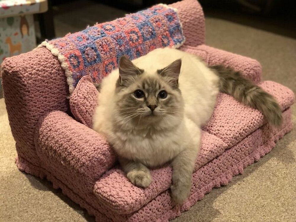 1. «Я связала и эту кошачью кушетку с подогревом, и сейчас работаю над второй, чтобы получился комплект. Знакомьтесь, это Рипли!»