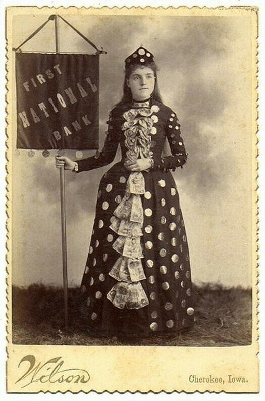 Всё верно, друзья, вы уже начали понимать самую суть. На платье девушки действительно монеты и денежные купюры.