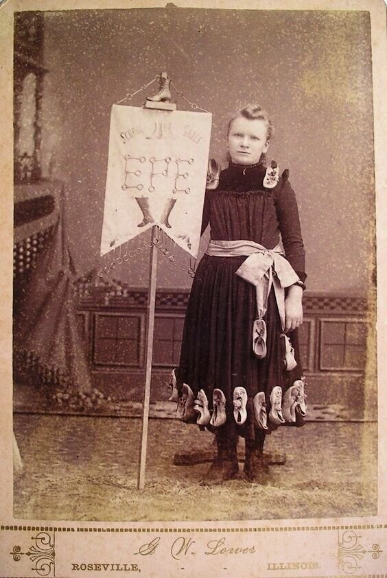 Девушка-модель на роликовых коньках рекламирует обувной магазин некоего Роберта Кирка. Мы видим табличку, сообщающую о распродаже, а также туфли, сапоги и баночки с кремом для обуви, которые чередуются прямо на её наряде.
