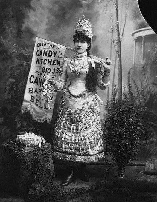 Если вы вдруг не поняли, то это реклама магазина сладостей. Ходячая, так сказать. И да, вам не показалось, юбка и головной убор дамочки обильно покрыты конфетами, а с шеи и рук свисают целые конфетные "бусы".
