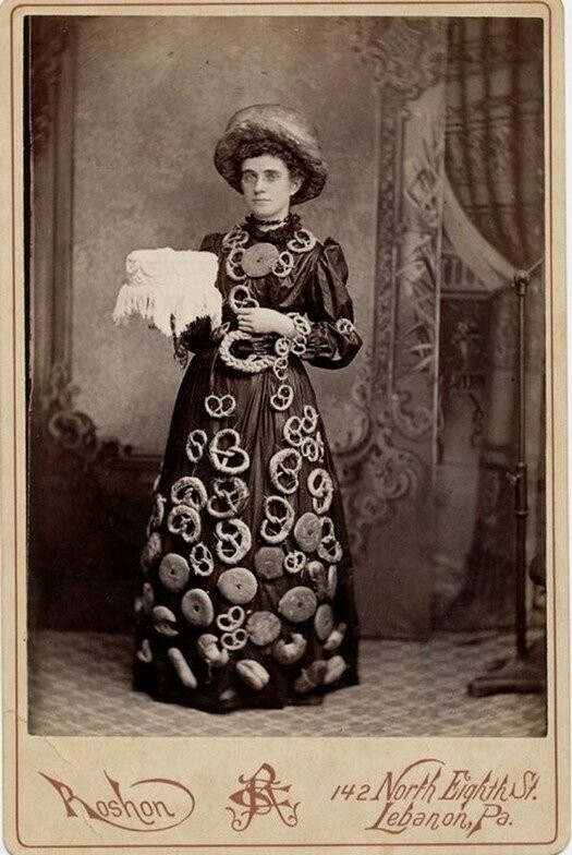 Вот, например, одна из моих фавориток: дама, рекламирующая пекарню. Её одежда не только покрыта кренделями и пончиками, но даже шляпа сделана из огромного каравая!