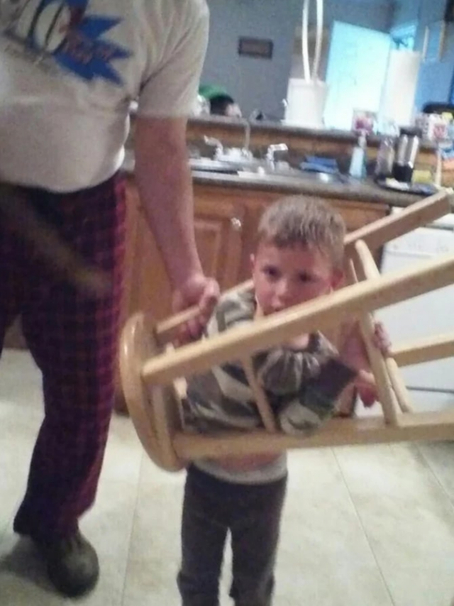 Этот малый решил поиграть со стулом, но, кажется, что-то пошло не по плану