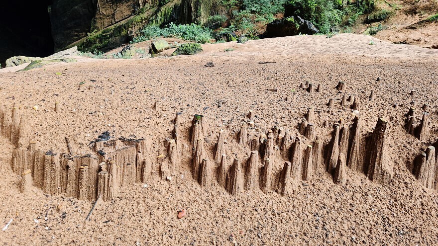 А эти «песчаные башенки» образуются из капель воды, падающих с потолка пещеры, и зыбучих песков. Части, которые заблокированы галькой и камнями, остаются стоять.