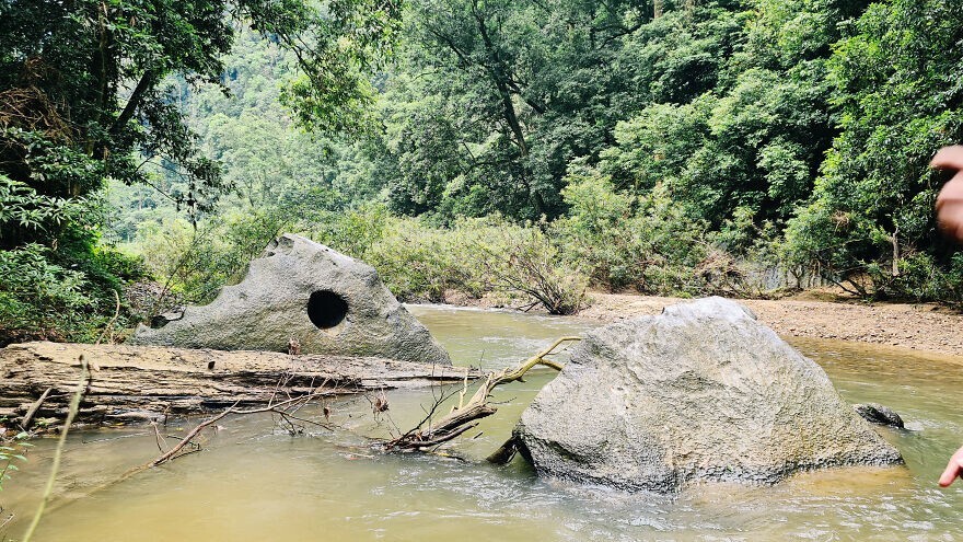 В небольшом ручье по дороге к пещере есть камень с большой дырой внутри. Мы шутили, что каждый, кто проходит здесь, должен бросить туда маленький камешек — своего рода плата за пересечение ручья.