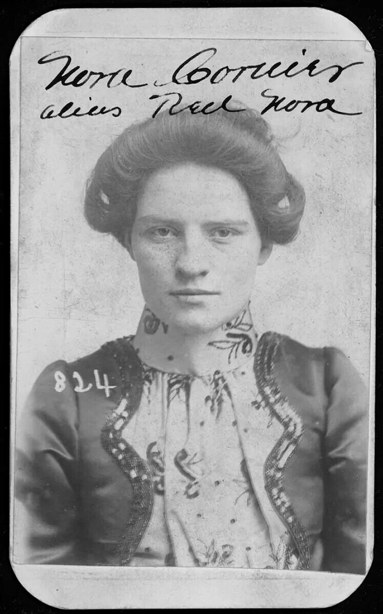 Нора Курьер была более известна как «Красная Нора». 31 марта 1901 года полиция Омахи арестовала девушку за кражу ...лошади. Согласно протоколу, ей было 22 года, у неё были серо-голубые глаза и шрам на лбу. Интересно, что на снимке его не видно.