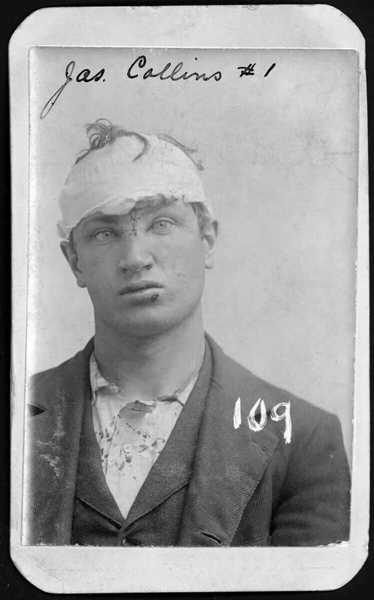 Джеймс был арестован 12 мая 1897 года за кражу со взломом. На снимке видно, что его голова перевязана. Согласно протоколу, Коллинз сбежал и был арестован повторно только почти через год. Видимо, при втором задержании с ним уже не церемонились и 23-летний портной из Омахи был отправлен в тюрьму, чтобы отбыть пятилетний срок.