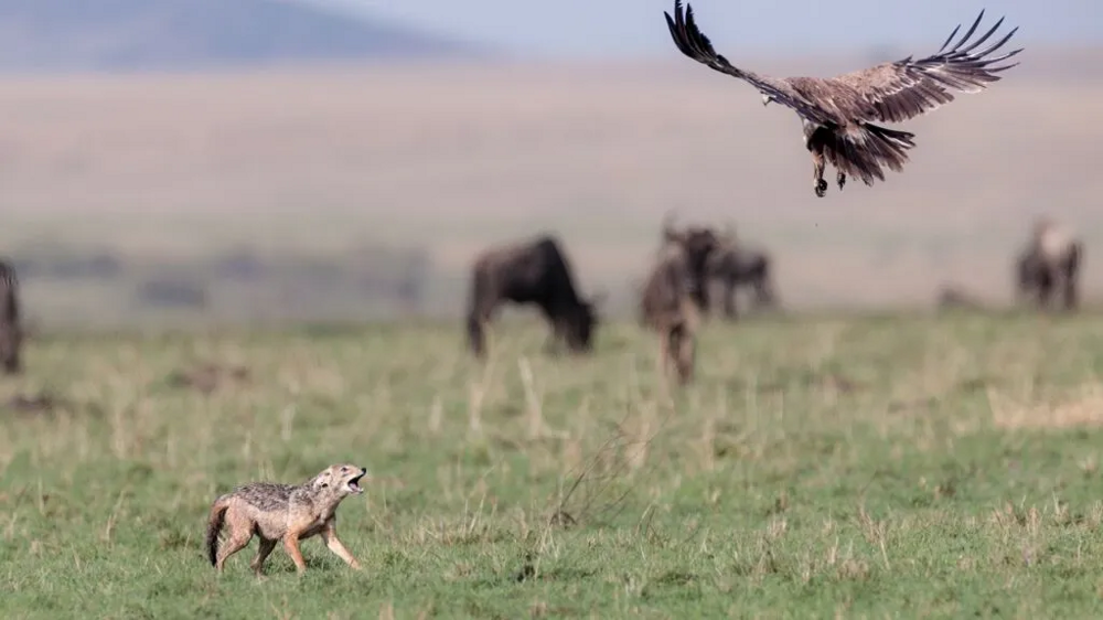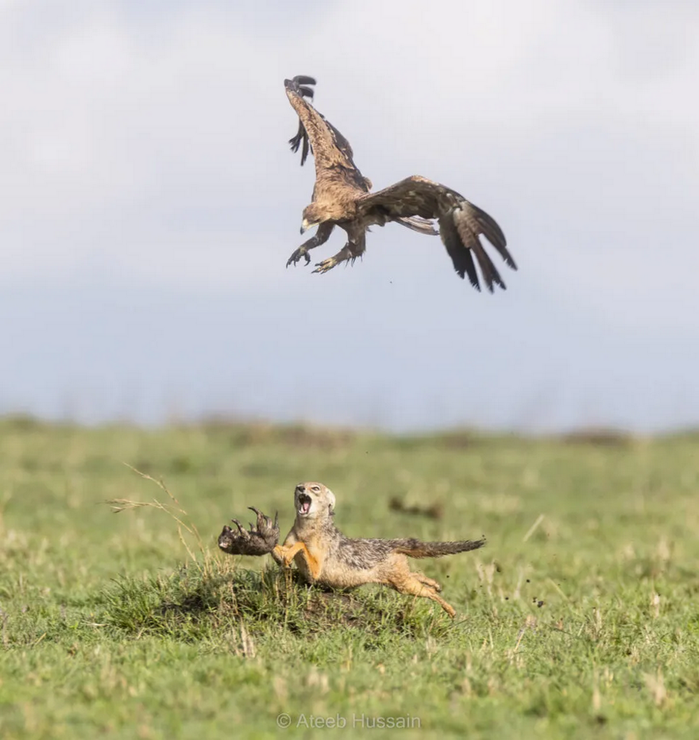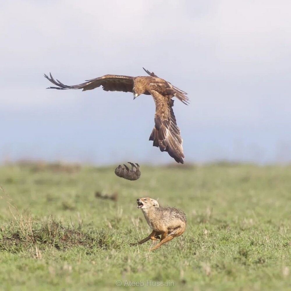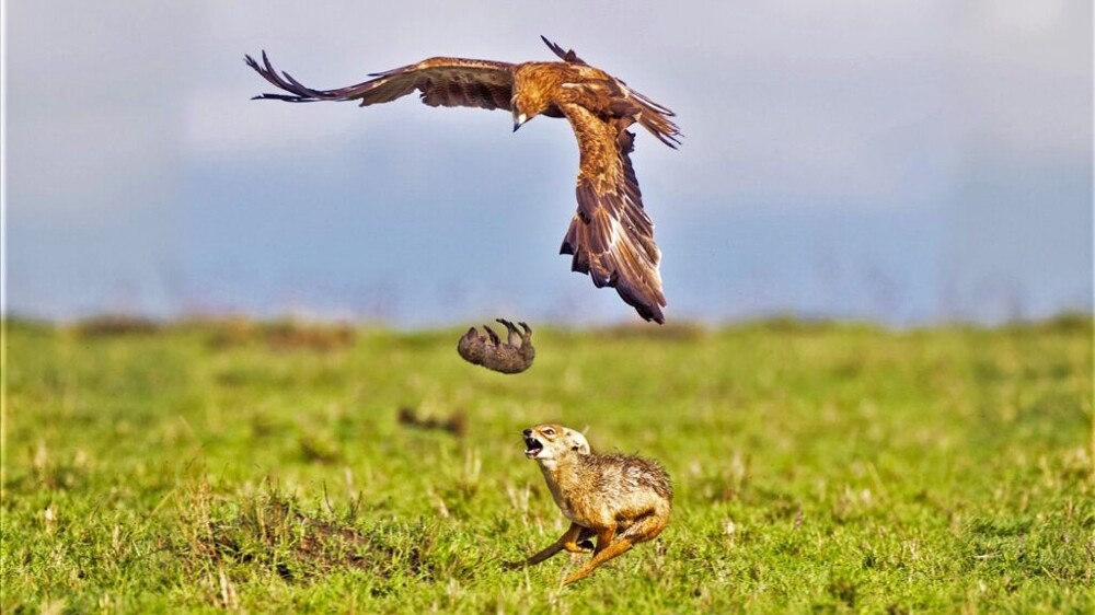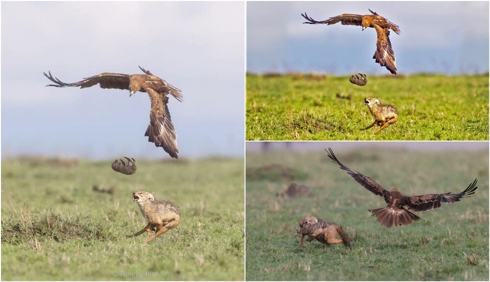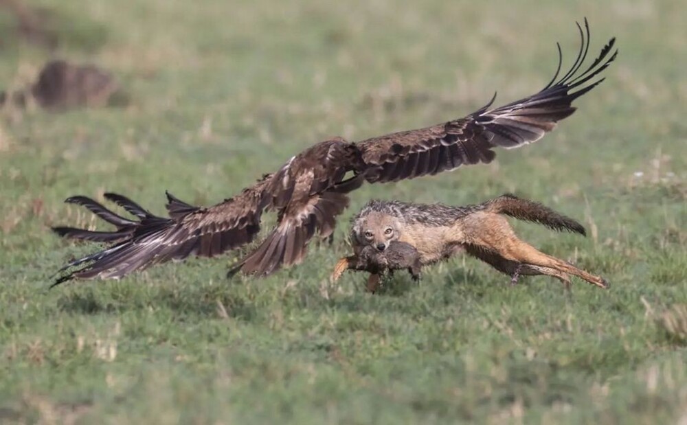 Невероятные фотографии показывают момент, когда шакал спасает своего детеныша из лап орла.